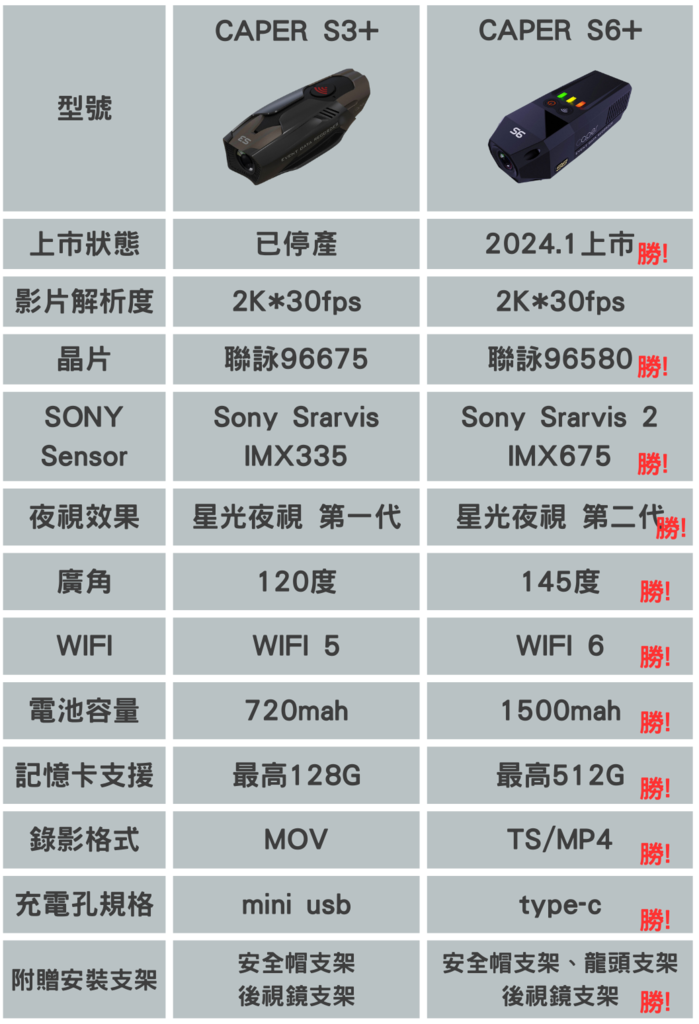 CAPER S3+ vs S6+簡易比較表: