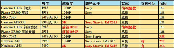 安瑟2020年 雙11 推薦的行車記錄器機型如下表,價格由低至高排序