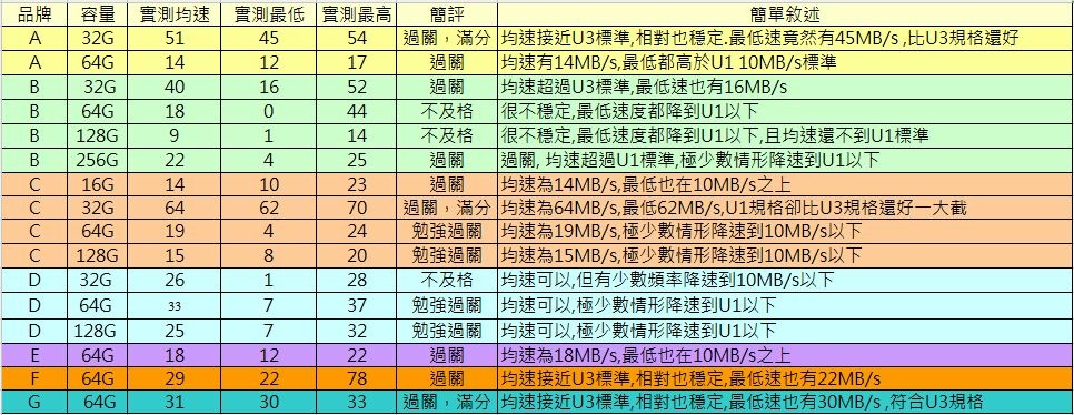 3.有2個品牌呈現超高標準,都可以當U3卡來賣了。但這二個品牌只各測1片,樣本數也是不夠的。