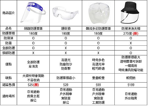 下方為上述幾款防護商品的簡易比較表,方便大家挑選適合自己的防疫商品