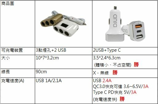 以下為常見的一對三點菸器擴充座和anra Type C三孔車充規格比較表
