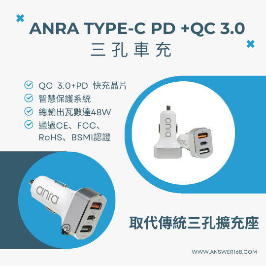 小編特別推薦您一款anra品牌的一對三車充頭,這款可同時使用3個電子設備,加上有QC3.0+PD雙快充,滿足了以汽車代步的上班族及經常忘記帶隨充上車的人們,有簡單整理了一下擴充座和車充頭的規格表提供參考。