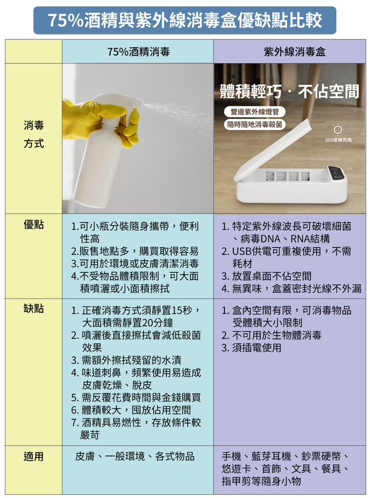 75%酒精消毒固然有便宜、方便攜帶、消毒效果好等優點,但在消毒上若想要兼具方便與事半功倍,則可以考慮再搭配「紫外線消毒盒」作為各式隨身小物的消毒神器!