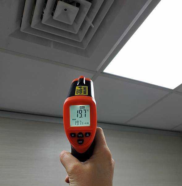 先對著冷氣出風口測一下,19.7度,應該是準的